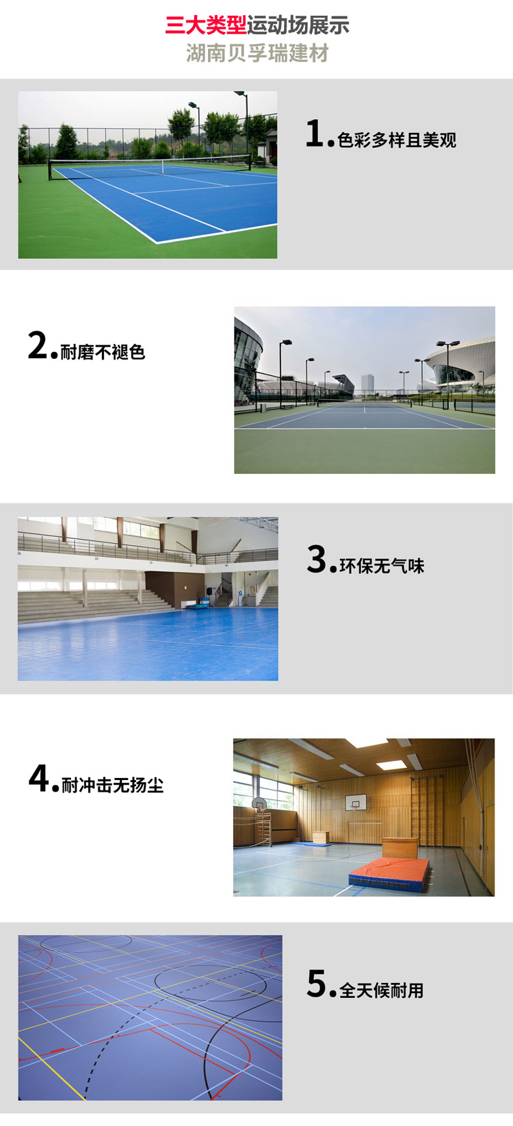 丙烯酸球場涂層系統的共通特性:是完全不含石棉、鉛或水銀等化合物,合乎環保原則。完全綠色環保、高度抗紫外光性能,顏色持久深入,不退色,不脫落。保養容易,維修費用低,在任何氣候條件下都堅固耐用。多種顏色可供選擇,包括藍、紅、深綠和淺綠等。使用壽命長,一般在6年以上,如基礎質量優異其使用壽命還可延長。面層有效舒緩沖力,降低對運動員的傷害及疲勞。國際網球協會(ITF)認可產品,國際比賽場地適用。丙烯酸涂層系統適用于混凝士基礎層與瀝青基礎層,以相宜的價格,提供優質的運動場地面材料。被推崇為最經濟的休閑及專業網球場籃球場地面系統。
