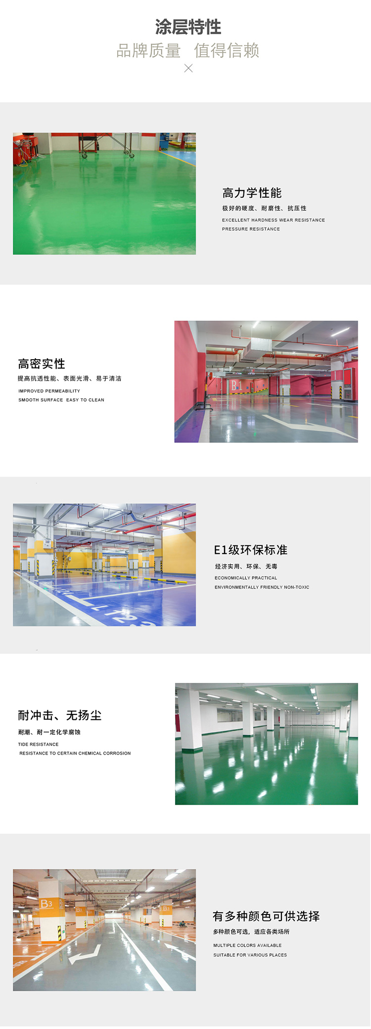 具有耐強酸堿、耐磨、耐壓、耐沖擊、防霉、防水、防塵、止滑以及防靜電、電磁波等特性,顏色亮麗多樣,清潔容易。它采用一次性涂覆工藝,不管有多大的面積,都不存在連接縫,而且還是一種無灰塵材料,具有附著力強,耐磨擦,硬度強等特點。